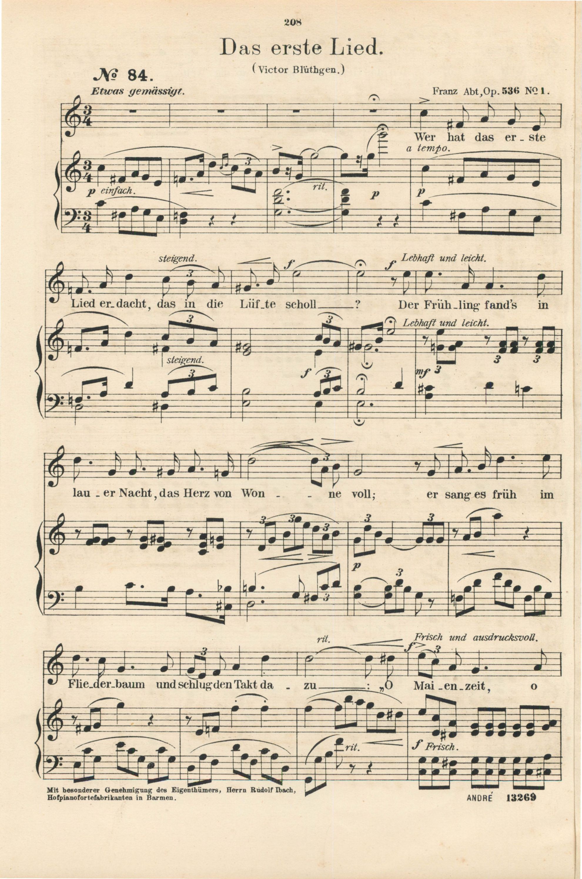 für Sopran oder Tenor mit Pianofortebegleitung komponiert von Franz Abt