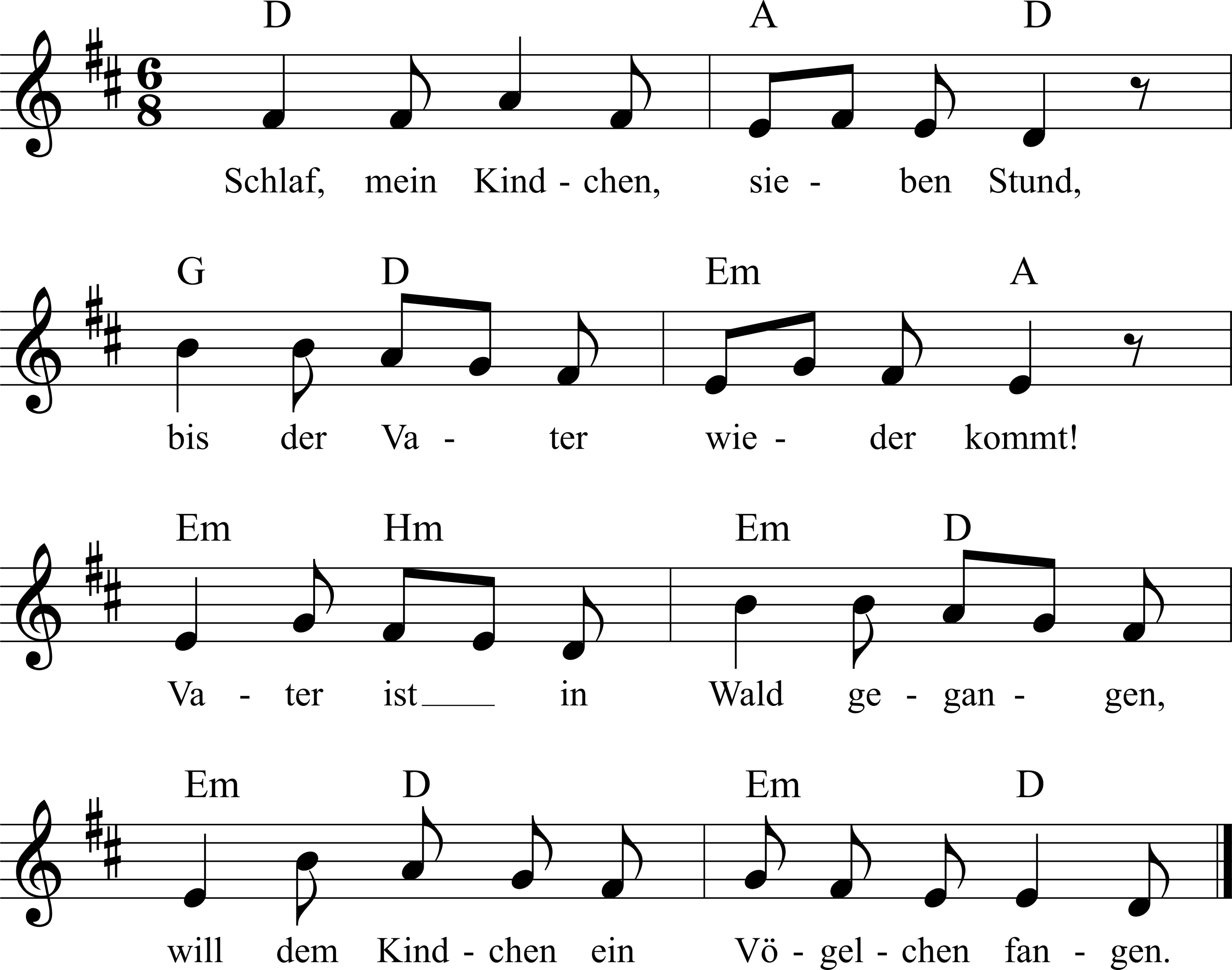 Schlaf, mein Kindchen, sieben Stund,Bis der Vater wiederkommt!Vater ist in Wald gegangen,Will mei'm Kindchen ein Vögelchen fangen.
